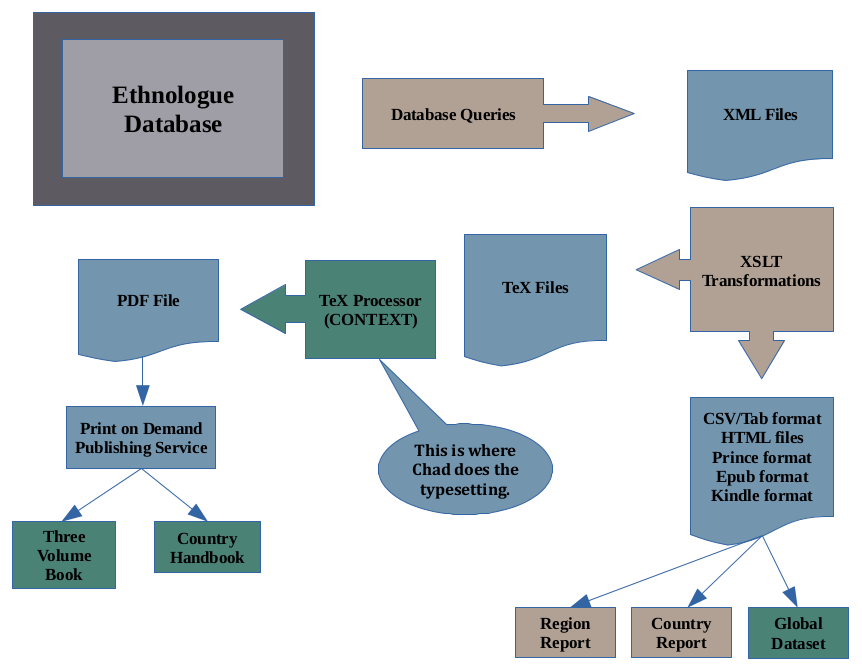 Chad's work with the Ethnologue started in 2012 and is multifaceted. He is the webmaster for ethnologue.com, database admin, database software interface admininistrator, wiki administrator and typesetter for the printed versions of the Ethnologue.